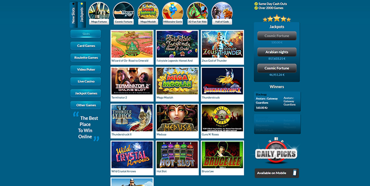 Sajtens spelutbud är enkelt att navigera. Välj mellan vad som för dagen är populärt, eller scrolla de olika spelkategorierna för en fullkomlig överblick. Med mer än 2000 titlar i spelautomatgenren står casinot ut i konkurrens med de allra bästa casinosajterna. En mer autentisk spelupplevelse är också möjlig, i kategorien livecasino kan du spela med en riktig dealer som streamer i realtid. Deras liveutbud kanske inte är på samma nivå som de bästa livecasinon, men är ändå värt ett besök tycker vi.