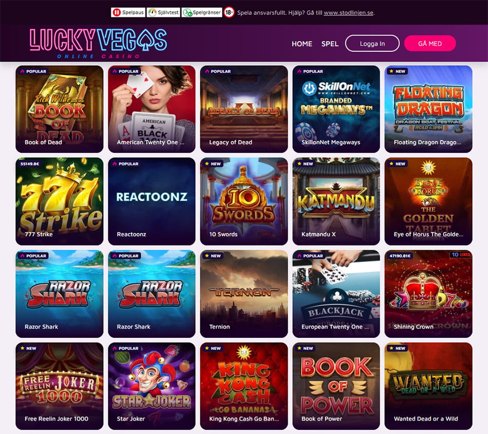 LuckyVegas har en otroligt användarvänlig casinosida som gör det enkelt att hitta allt du letar efter – inklusive tillgång till Spelpaus och Stödlinjen. Överst hittar du huvudmenyn med länkar till alla de övriga sidorna och när du till exempel besöker spelsidan får du även möjligheten att filtrera spelen genom en sökfunktion. Utöver det bytar du enkelt språk till svenska, norska eller engelska, överst på sidan och kan på så vis skräddarsy din upplevelse baserat på plats.